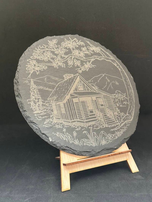 Deze ronde leistenen plaat combineert natuurlijke elegantie met een persoonlijke touch. Dankzij de lasergravure wordt elke leisteen uniek. Perfect als decoratief stuk of om hapjes stijlvol te serveren.